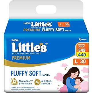 Little’s Premium Baby Diapers L Size (Large) Pants Style | 9-14 kg | 30 Count – Pack of 1 | FluffySoft Baby Diaper with Leakage Guard, Wetness Indicator & 12 Hours Absorption