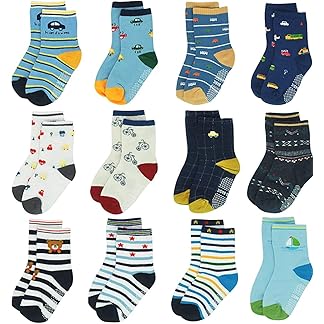 FIMALIA Non Slip Kids Toddler Socks with Grip, Assorted Prints, Socks for Babies to Toddlers, Anti Skid Socks, Crawling Socks with Grippers (Pack of 4,6 &12 Pair) (Color & Print May Vary)
