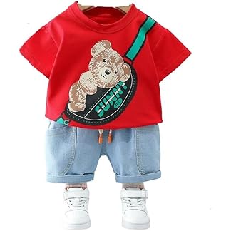 Googo Gaaga Boy’s Cotton Printed T-shirt with Denim Shorts Set in Red Color