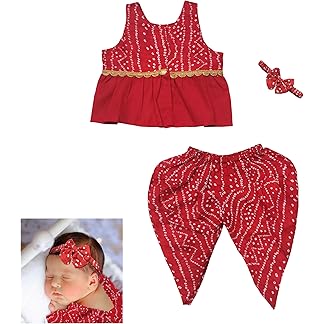 The Root And Craft Kids Birthday Photoshoot Outfit Dress Girls Bandhani printed Top With Dhoti pant & Hairband Born Baby Photography Photoshoot Props(0to 18 Month)