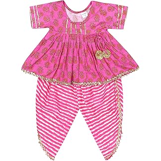 superminis Cotton Blend Baby Girl’s Jaipuri Print Frock Style Kurti With Frill Sleeves And Dhoti Style Salwar With Elastic Closure Ethnic Dress Clothing Set