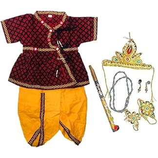 TMT HUB Traditional Krishna Dress for Kids | Janmashtami Kanha Costume Infant Bal Gopal Outfit for Boys, Set of 7 (Kurta, Dhoti, Bansuri, Mor Pankh, Mukut, Bandhni, Patka)