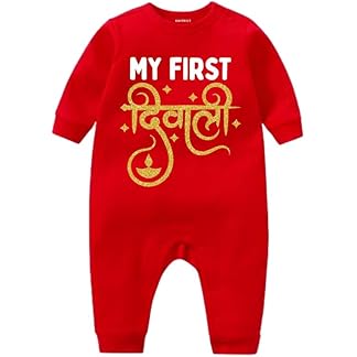 KNITROOT Diwali Jumpsuit, My First Diwali, Full Sleeve, Shoulder-Snap-Buttons, Knee Length, Cotton Unisex Jumpsuits, Rompers, Bodysuits for New Born Baby, Red, Infant Clothes for Boys & Girls