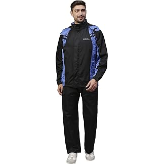 ZEEL Rain Coat for Men Waterproof for Bike Riders with Adjustable Hood along with inner pockets,Waterproof Raincoat with Polyester Jacket,Pants and Waterproof Drawstring Bag,AZ05 Black-Blue XL