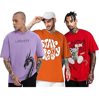 LEOTUDE Half Sleeve Oversized Printed T-Shirt for Men, Round Neck Longline Drop Shoulder | Colorful Printed Combo T-Shirt (Pack of 3)