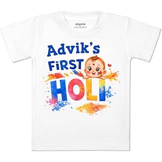 ARVESA Customised Baby Name My First Holi Baby T Shirt for Baby Boy and Baby Girl White Cotton 0–24 Months Design No 2122 My First Holi