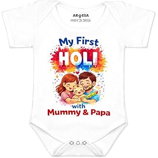 ARVESA My First Holi Baby Romper for Baby Boy and Baby Girl White Cotton 0–12 Months Design No 2123 My First Holi Mummy & Papa