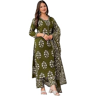 PARTHVI Women’s Pure Cotton Printed Straight Kurta Set with Palazzo Pants & Dupatta- Ethnic Wear, Green
