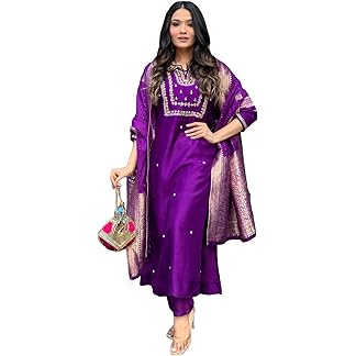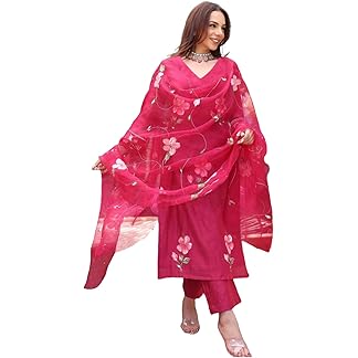 GoSriKi Women’s Rayon Viscose Embroidered Straight Kurta with Pant & Dupatta