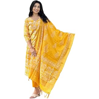 Arayna Women’s Pure Cotton Block Printed Ethnic Wear Kurta Set with Palazzo Pants & Dupatta