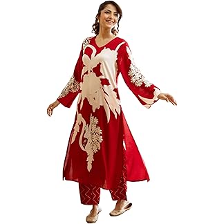 GEKHA|Women’s Red Cotton Printed Flared Kurta with Cotton Pant and Cotton Printed Dupatta Sets | Ethnic Set | Dupatta Set | Suit Set | Kurta Set | Wedding Suit Set
