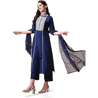 GoSriKi Women’s Cotton Blend Straight Embroidered Kurta with Pant & Dupatta