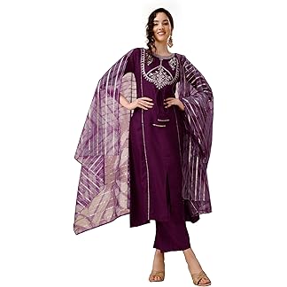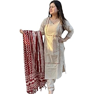 GoSriKi Women’s Cotton Blend Embroidered Straight Kurta with Pant & Dupatta