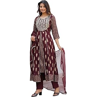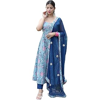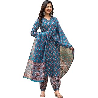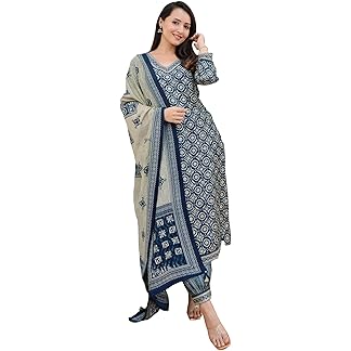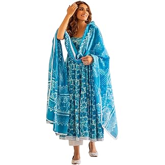 GoSriKi Women’s Cotton Blend Anarkali Printed Kurta with Pant & Dupatta