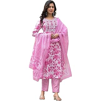 GoSriKi Women’s Cotton Blend Straight Printed Kurta with Pant & Dupatta