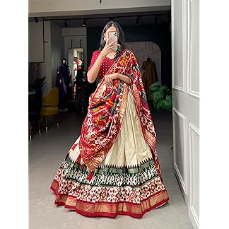 MR CREATION Women,s Tussar Silk With Leheriya And Foil Print Lehenga choli Set (WHITE)