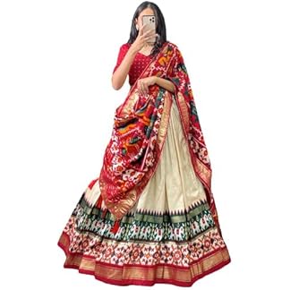 FIBREZA Women’s bandhani print chaniya choli showcases intricate ajrakh print Foil Work Patola Print Semi-stitched Lehenga choli Set