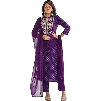 GoSriKi Women’s Cotton Blend Straight Embroidered Kurta with Pant & Dupatta