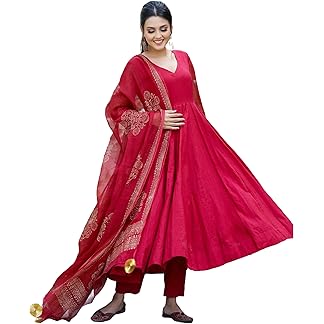 GoSriKi Women’s Cotton Blend Solid Anarkali Kurta with Pant & Dupatta