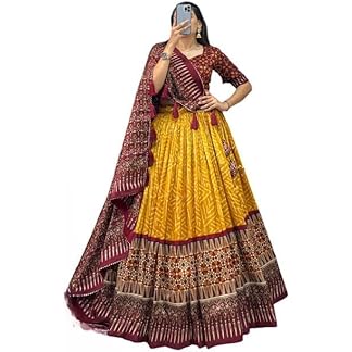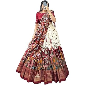 Jay Varudi Creation Lehenga Choli Women’s Trending Designeer Tussar Silk Lehenga Choli Print with Foil Work With Unstitched Blouse Patola Print Adorned with Foil Work For Navrati & Wedding