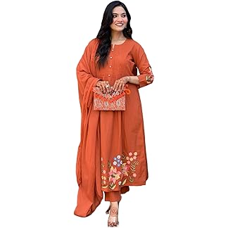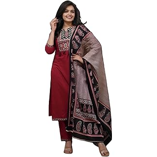 BHARVITA Women’s Cotton Handwork and Printed Straight Kurta with Pant And Dupatta Sets
