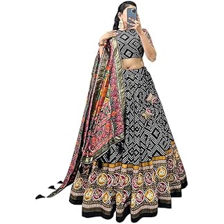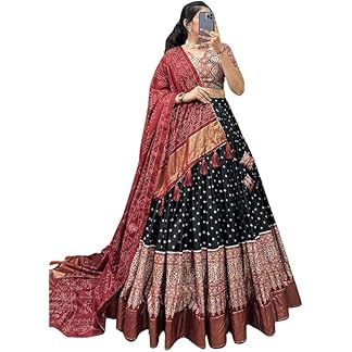 GS ENTERPRISE Women’s Trending Designeer Tussar Silk Lehenga Choli Print with Foil Work With Unstitched Blouse Patola Print Adorned with Foil Work For Navrati || Wedding