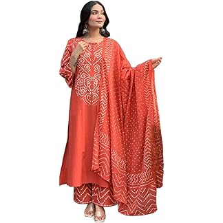 GoSriKi Women’s Viscose Rayon Straight Kurta Pant Dupatta Set | Bandhani Block Print Suit Set | Cotton Kurta Set with Dupatta Ethnic Dress | Festive Kurta Set
