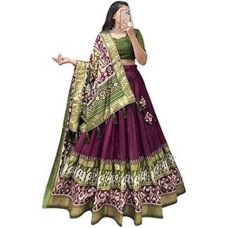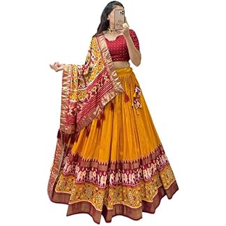 Snazzy Stitch Women’s Trending Designeer Tussar Silk Lehenga Choli Print with Foil Work With Unstitched Blouse Patola Print Adorned with Foil Work For Navrati || Wedding