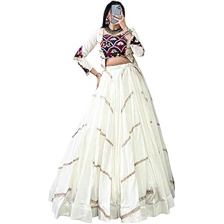 Dharm Choice Traditional Navratri Chaniya Choli White Cotton Lehenga with Embroidered Border Multicolored Floral Pattern