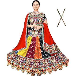 NATKHAT DRESS – Ghaghra Choli With Dandiya Stick for Garba, Ethnic Gujarati Style Cotton Rayon Long Skirt Lehenga With Free Dandiya