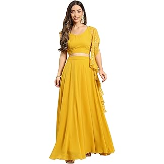 TRENDMALLS Women’s Georgette Lehenga Choli Crop Top with Foil Print Dupatta (L254-Yellow-Semi-Stitch)