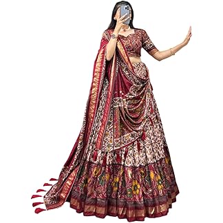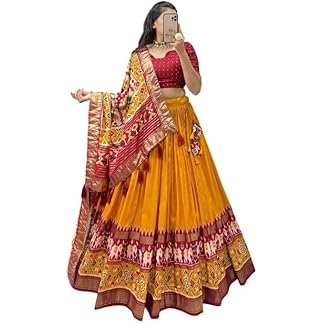 Women’s Trending Designeer Tussar Silk Lehenga Choli Print with Foil Work With Unstitched Blouse Patola Print Adorned with Foil Work For Navrati || Wedding