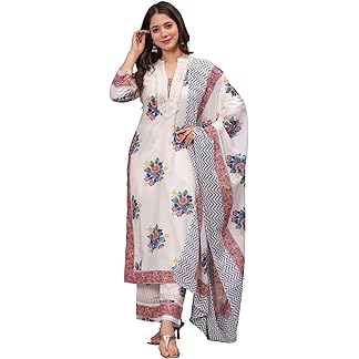 Amayra Women’s Pure Cotton Printed Straight Kurta Set with Palazzo Pants & Dupatta- Ethnic Wear, White