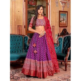 Women,s Tussar Silk With Leheriya And Foil Print Lehenga choli Set (PURPLE)