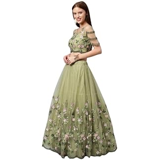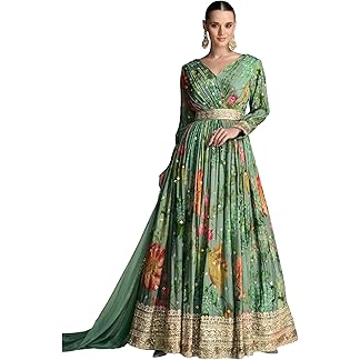 Miss Ethnik Women’s Green Chinon Stitched Top With Chinon Dupatta Full Sleeve Embroidered Anarkali Gown (ME-1190)