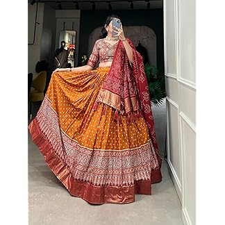 Women,s Tussar Silk With Leheriya And Foil Print Lehenga choli Set (YELLOW)