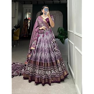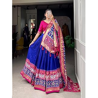 Women,s Tussar Silk With Patola And Foil Print Lehenga choli Set (BLUE)
