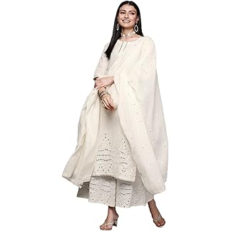 GoSriKi Women’s Cotton Blend Straight Embroidered Kurta with Pant & Dupatta