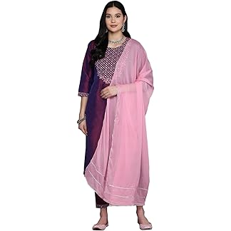 INDO ERA Women’s Embroidered Silk Blend Calf Length Straight Kurta Pant And Dupatta Set (KH9MR6194)