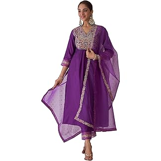 INDO ERA Women’s Silk Blend Floral Embroidered A-line Kurta Palazzo with Dupatta Set