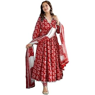 PARTHVI Women’s Printed Cotton Anarkali Kurta & Pant With Dupatta Set