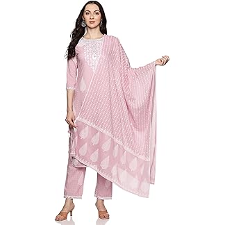 BHARVITA Women’s Cotton Blend Lucknowi Embroidered Chikankari Straight Kurta with Pant Set