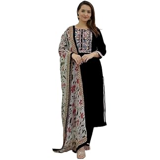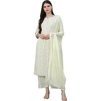 INDO ERA Women’s Silk Blend Floral Embroidered A-line Kurta Palazzo with Dupatta Set