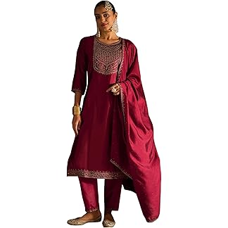INDO ERA Women’s Embroidered Silk Blend Calf Length Straight Kurta & Pant With Dupatta Set (SHTUR7891)
