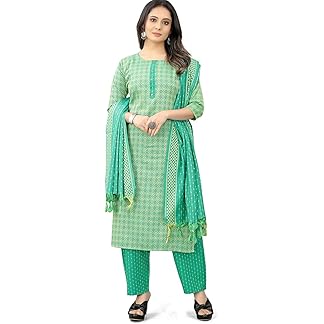 BELLUXA Women’s Cotton Salwar Suit Set,Fancy Salwar Suit Set with Dupatta, 3/4 Sleeves, Round Neck, Printed Kurti with Embroidery, Solid Pant, Printed Dupatta for Girls and Woman