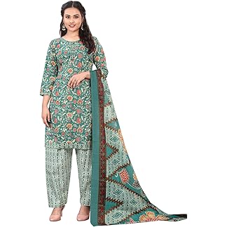 BELLUXA Women’s Cotton Salwar Suit Set,Fancy Salwar Suit Set with Dupatta, 3/4 Sleeves, Round Neck, Printed Kurti with Embroidery, Solid Pant, Printed Dupatta for Girls and Woman