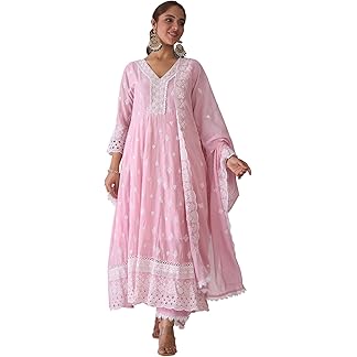 INDO ERA Women’s Pure Cotton Embroidered Anarkali Kurta & Pant With Dupatta Set