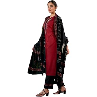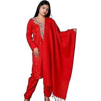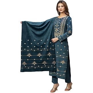 KASANI Kashmiri Embroidered Winter Suit Set for Women Woolen Kurta Set Warm Kurti with Pant and Dupatta with Side Pockets (S to XXL)