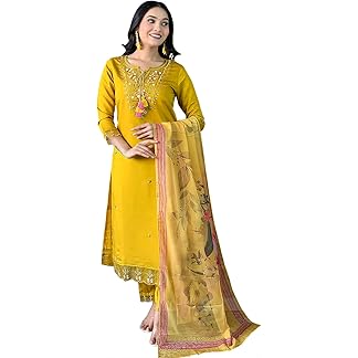 Women’s Mustard Chanderi with Cotton Lining Embroidered Straight Kurta with Chanderi Silk Pant and Crep Silk Printed Dupatta Sets (NX2-556)