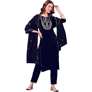 BHARVITA Women’s Velvet Embroidery Straight Kurta Pant with Dupatta